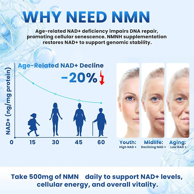 Enter NMN, a form of vitamin B3 that boosts NAD+ levels, combating age-related cellular decline. Our research-backed NMN supplement rejuvenates cells. It's your ally in turning back the biological clock, offering renewed energy and a zest for life.
