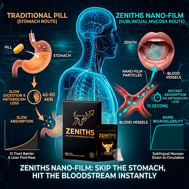 ZENITHS utilizes X-TRIDENT™ 720 nano-film technology rather than traditional tablets. It is absorbed sublingually (under the tongue), kicking in within 15 seconds with 98% bioavailability, effectively bypassing the headaches and stomach upset common with old-school pills.